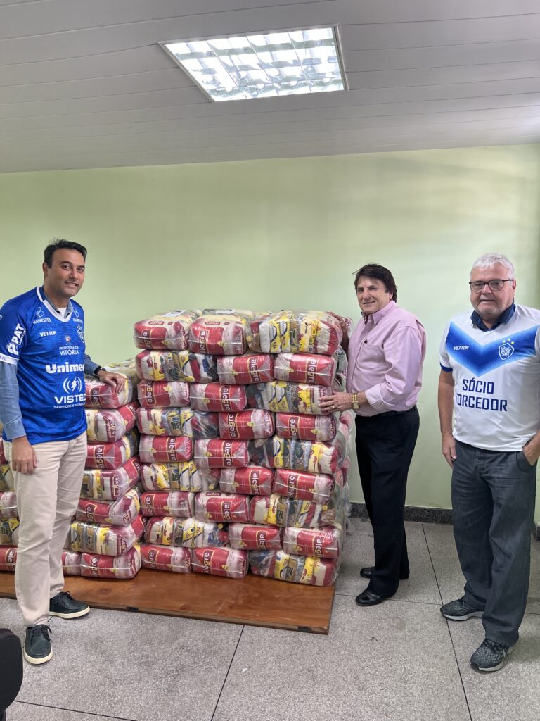 Perovano ao lado de Guto( Presidente do Vitória) e Rodolfo do Carmo que é Diretor do Vitória entregando cestas básicas pelo IDESPE ao Banco de Alimentos da Prefeitura de Vitória que foram distribuídas a várias famílias de Vitória.