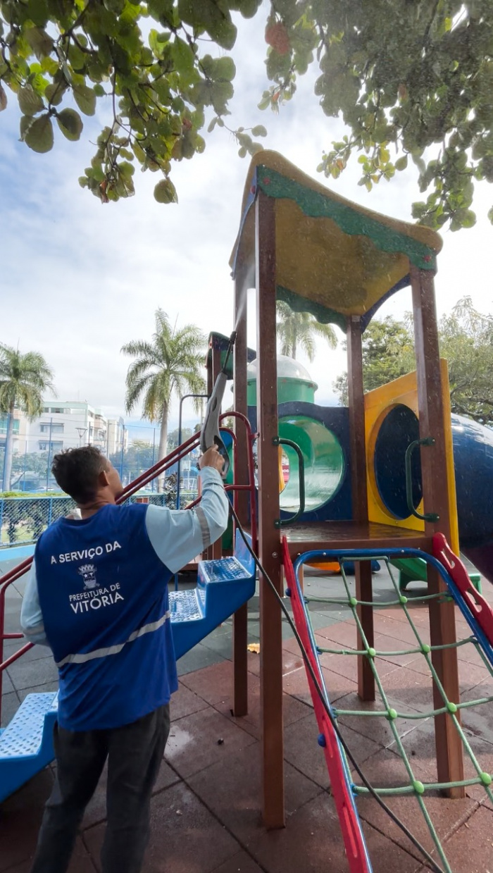 Para manter esse cenário sempre acolhedor e seguro, a Prefeitura de Vitória, por meio da Central de Serviços, realiza periodicamente a limpeza e higienização completa dos equipamentos e brinquedos instalados nos parques infantis da cidade.