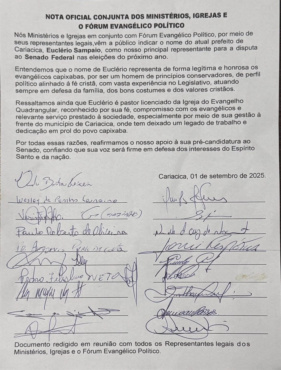 Euclério Sampaio nesta segunda- feira( 1 ) almoçou com líderes religiosos que redigiram e divulgaram uma nota conjunta afirmando que indicam o Prefeito de Cariacica Euclério Sampaio como principal representante na disputa a Senado, afirmando que Euclério Sampaio tem os valores cristãos que defendem, e a nota afirma que Euclério por ser Pastor licenciado e pela sua excelente gestão a frente de Cariacica contribuíram para decisão do Fórum Político Evangélico.