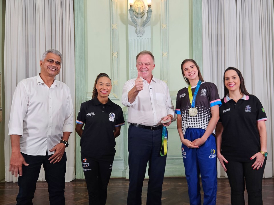 O governador do Estado, Renato Casagrande, e o secretário de Estado de Esportes e Lazer, José Carlos Nunes, receberam, na tarde desta quarta-feira (03), no Palácio Anchieta, em Vitória, as ginastas capixabas Geovanna Santos e Sofia Madeira, além da treinadora Gizela Batista, que representaram o Espírito Santo e o Brasil no Campeonato Mundial de Ginástica Rítmica, realizado em agosto, no Rio de Janeiro.