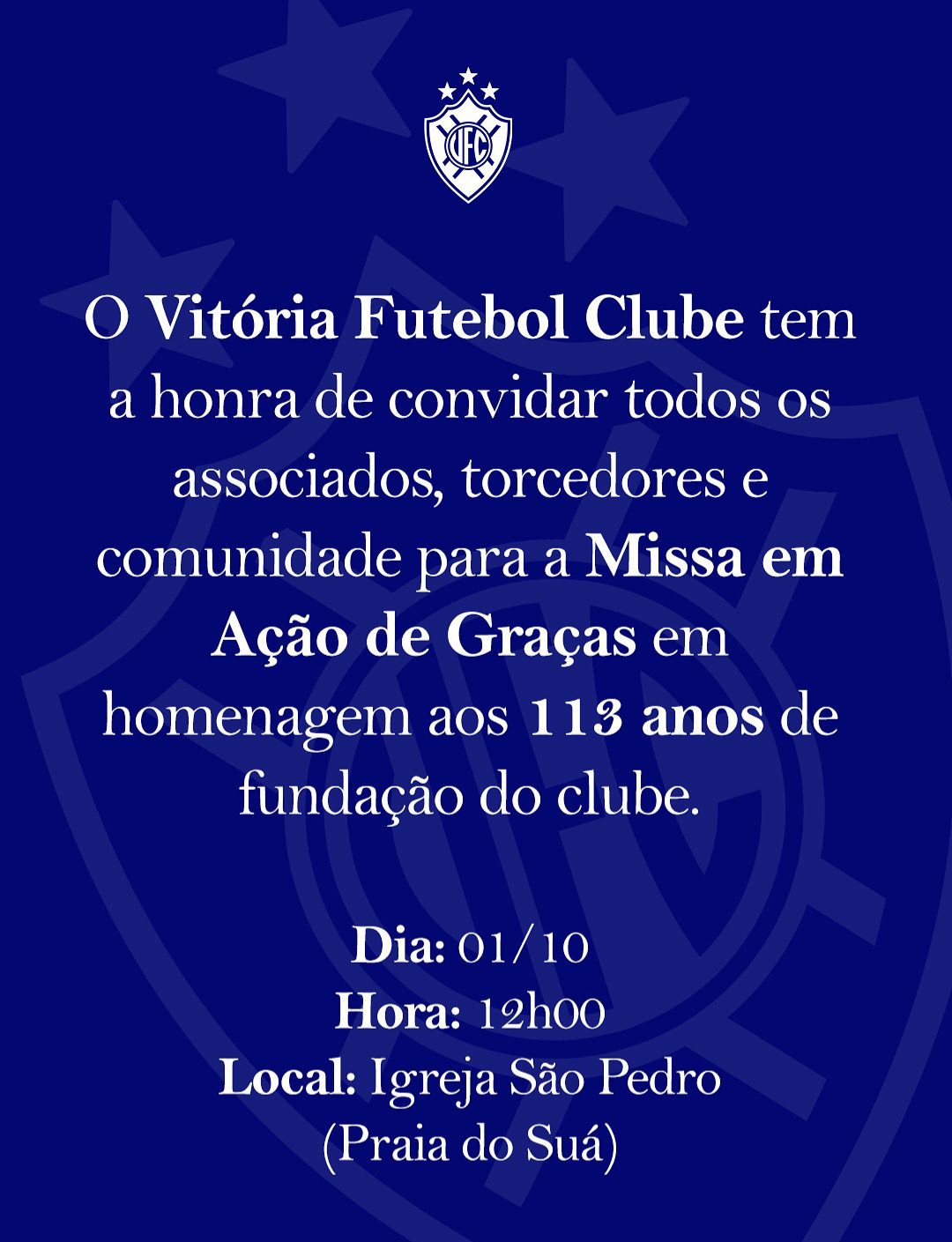 Amanhã Quarta- Feira( 1 ) que é a data do Aniversário do Vitória Futebol Clube acontecerá as 12h a Missa em Ação de Graças em homenagem aos 113 anos de fundação do clube na Igreja São Pedro na Praia do Suá.