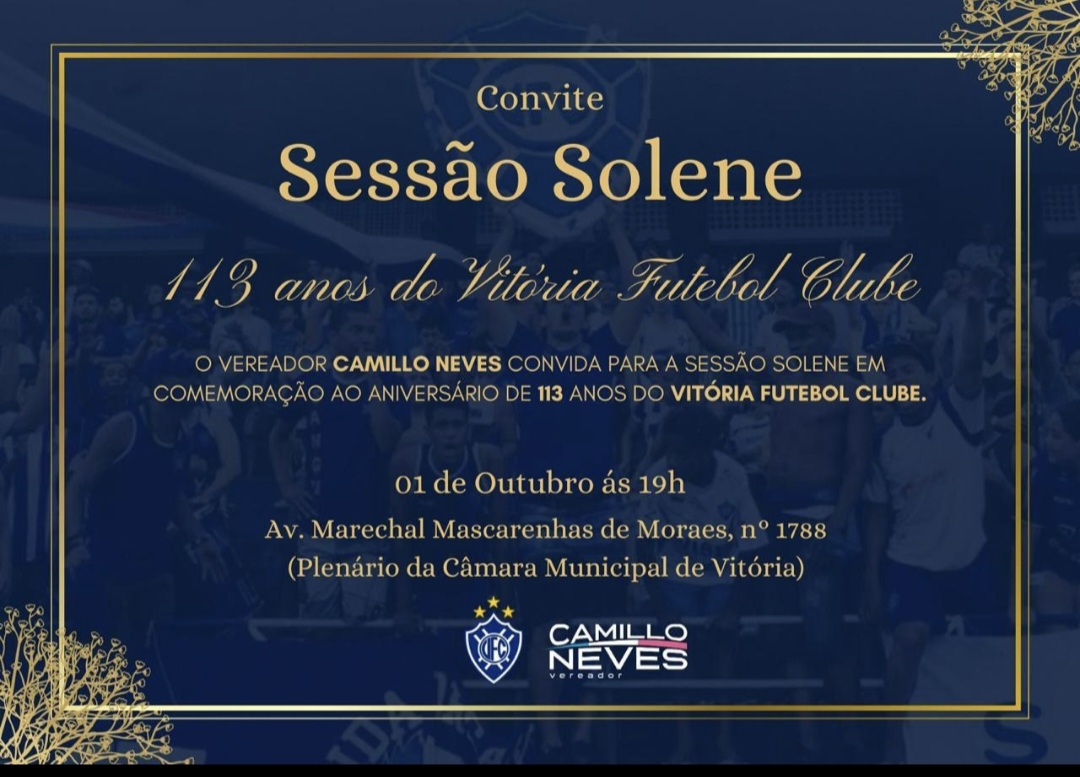 Às 19h na Câmara Municipal de Vitória o Vereador de Vitória Camillo Neves realiza uma Sessão Solene em homenagem aos 113 anos do Vitória Clube onde haverá homenagens a todos que ajudam a construir a história do Vitória Futebol Clube.
