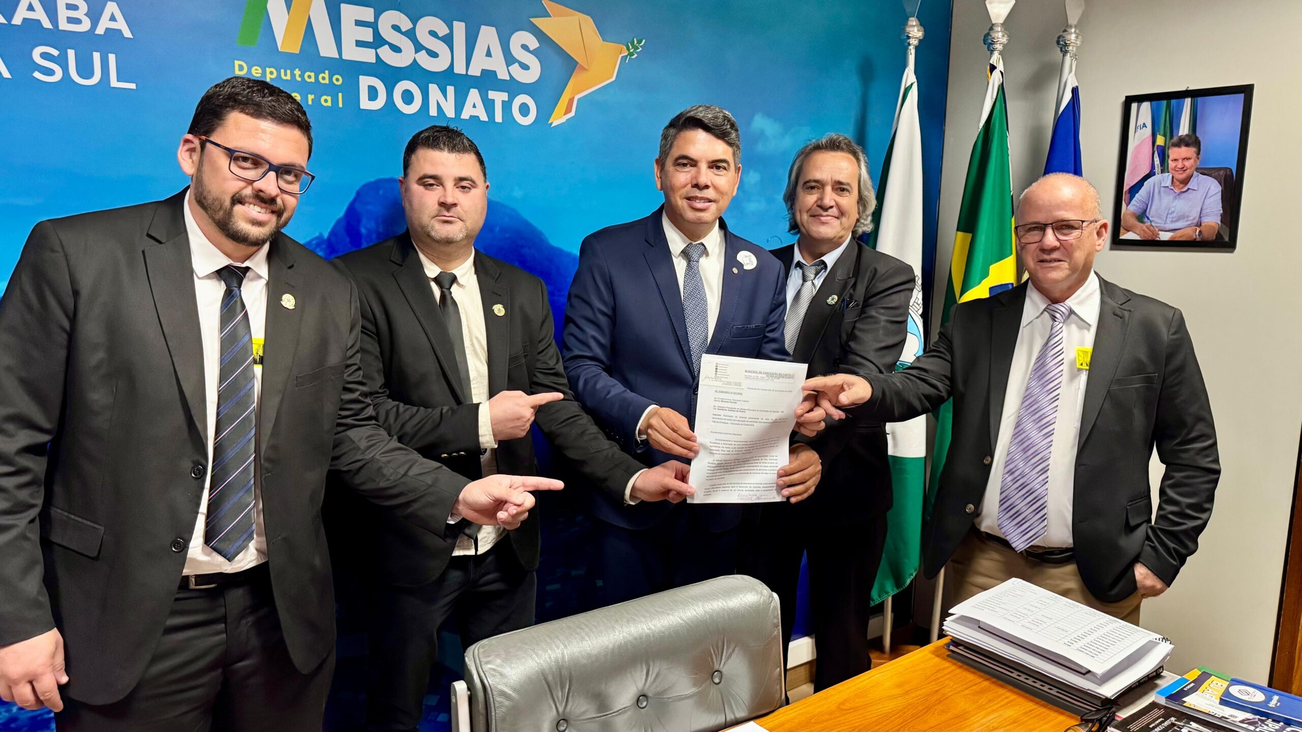 Em outro momento, Messias Donato também recebeu o presidente da Câmara Municipal, Humberto Rocha, e os vereadores Bim Mareto e Thiago Viana, além do prefeito da cidade. Na reunião, foi apresentado o pedido de uma emenda parlamentar para a aquisição de um caminhão toco, destinado a atender a comunidade rural da rota Vale do Emboque.