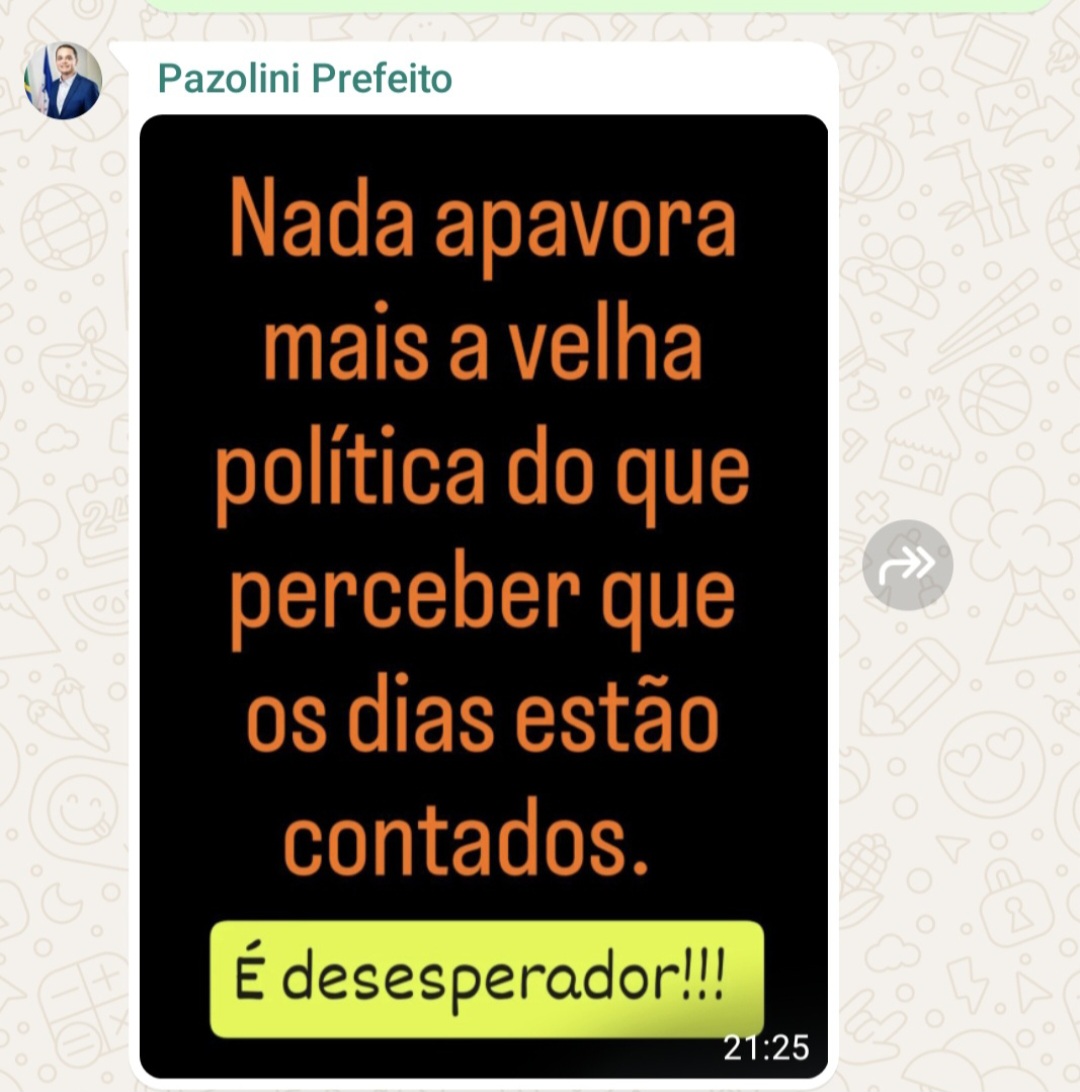 Após uma opinião sobre o processo que o Prefeito de Vitória Lorenzo Pazolini fez contra o Vereador de Vitória Dárcio Bracarense em um Grupo de Whatsapp, o Prefeito de Vitória de forma reativa publicou no Grupo a seguinte frase: ” Nada apavora mais a velha política do que perceber que os dias estão contados. É desesperador!!! A provável aliança entre Paulo Hartung e Lorenzo Pazolini representa a Nova Política que ele afirma?