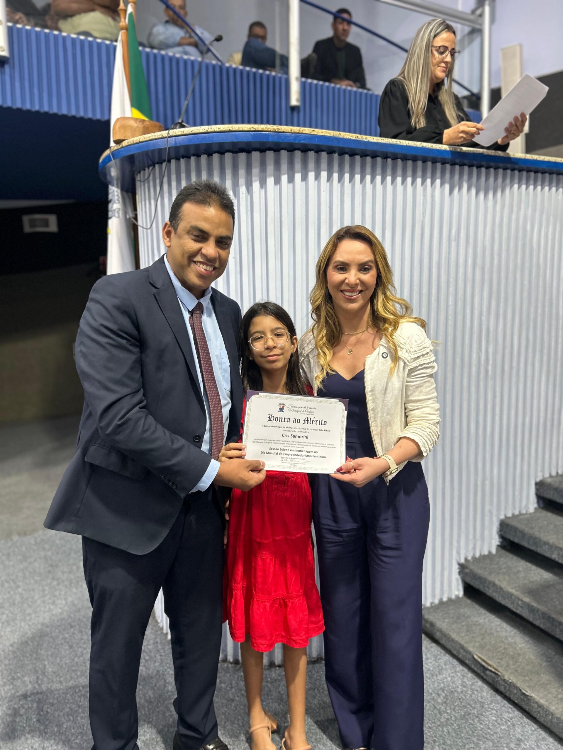 A Vice- Prefeita que é Empreendedora no setor gráfico foi homenageada pelo Vereador João Flávio e sua filha Valentina