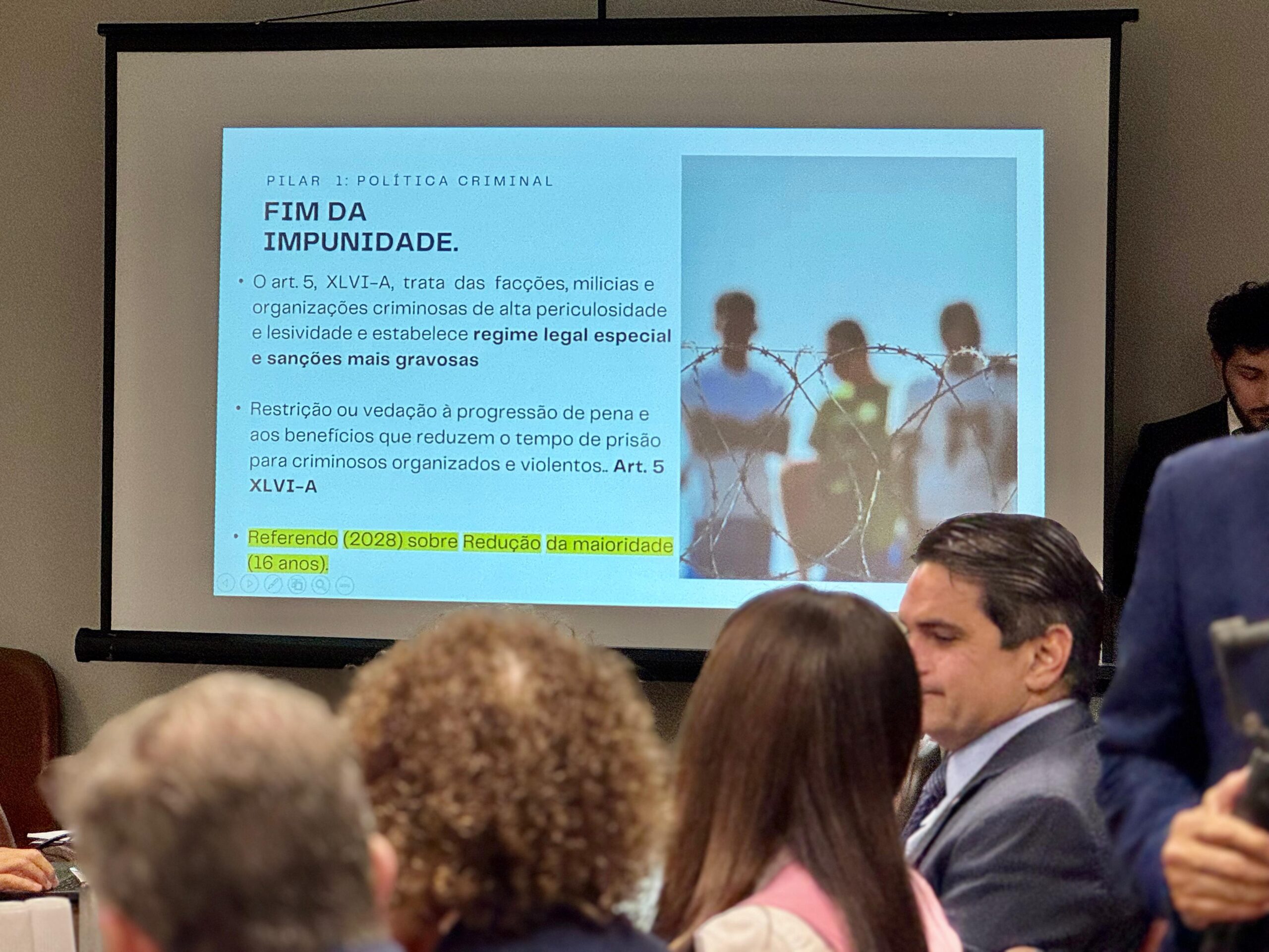 Outro eixo da proposta é a previsão de um referendo nacional em 2028 para decidir sobre a redução da maioridade penal para 16 anos, com regime de prisão diferenciado e separação dos demais detentos, preservando critérios específicos para esse público.